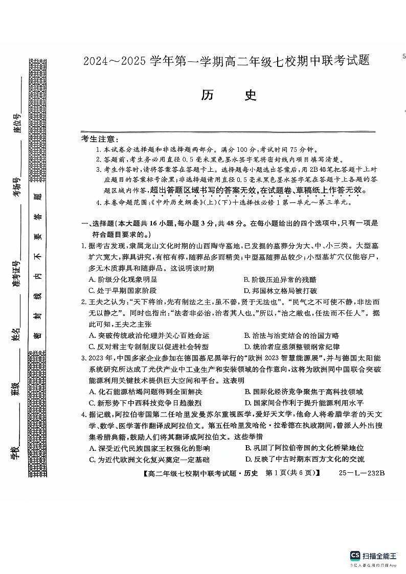 陕西省榆林市2024-2025学年第一学期高二年级七校期中联考试题历史