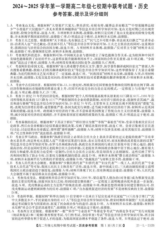 陕西省榆林市2024-2025学年第一学期高二年级七校期中联考试题历史答案