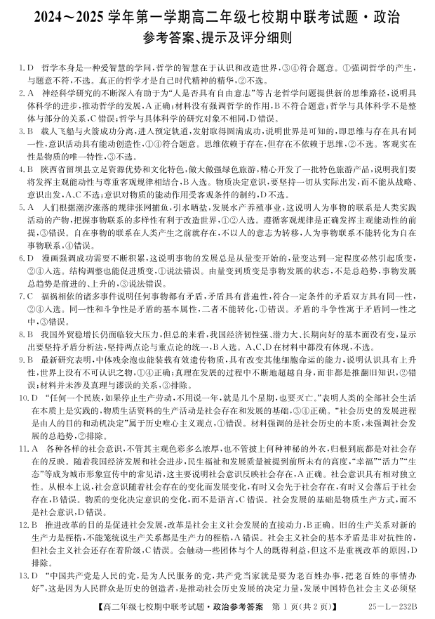 陕西省榆林市2024-2025学年第一学期高二年级七校期中联考试题政治答案