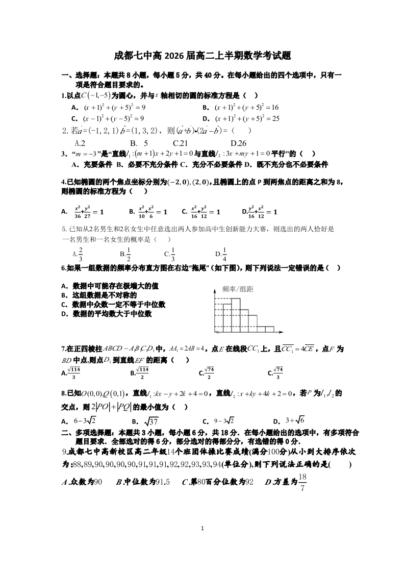 四川省成都市第七中学2024-2025学年度上期高2026届半期考试数学+答案