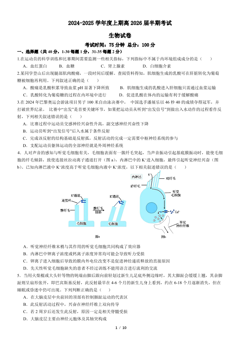 四川省成都市第七中学2024-2025学年度上期高2026届半期考试生物+答案