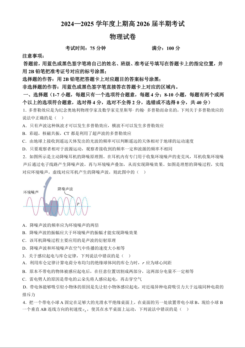 四川省成都市第七中学2024-2025学年度上期高2026届半期考试物理+答案