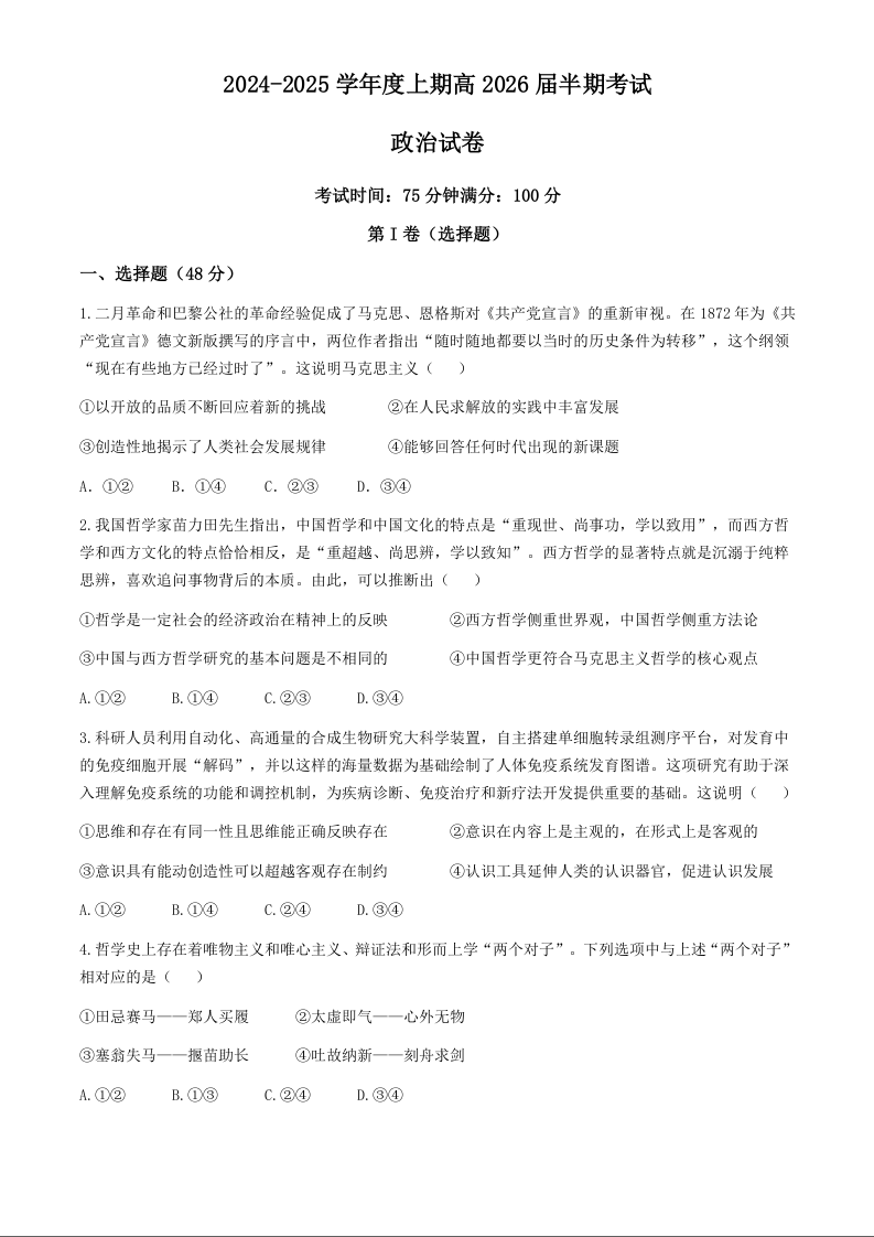 四川省成都市第七中学2024-2025学年度上期高2026届半期考试政治+答案
