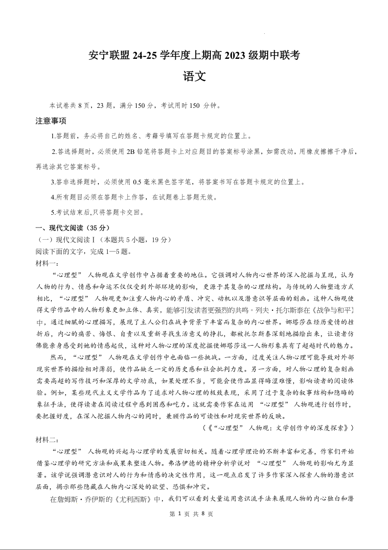 四川省安宁河高中振兴联盟2024-2025学年度上期高中2023级期中联考语文