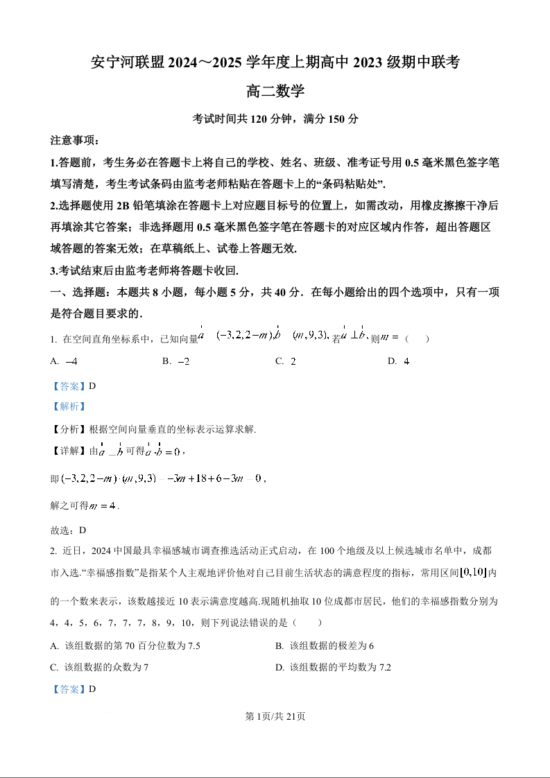 四川省安宁河高中振兴联盟2024-2025学年度上期高中2023级期中联考数学试题(解析版)