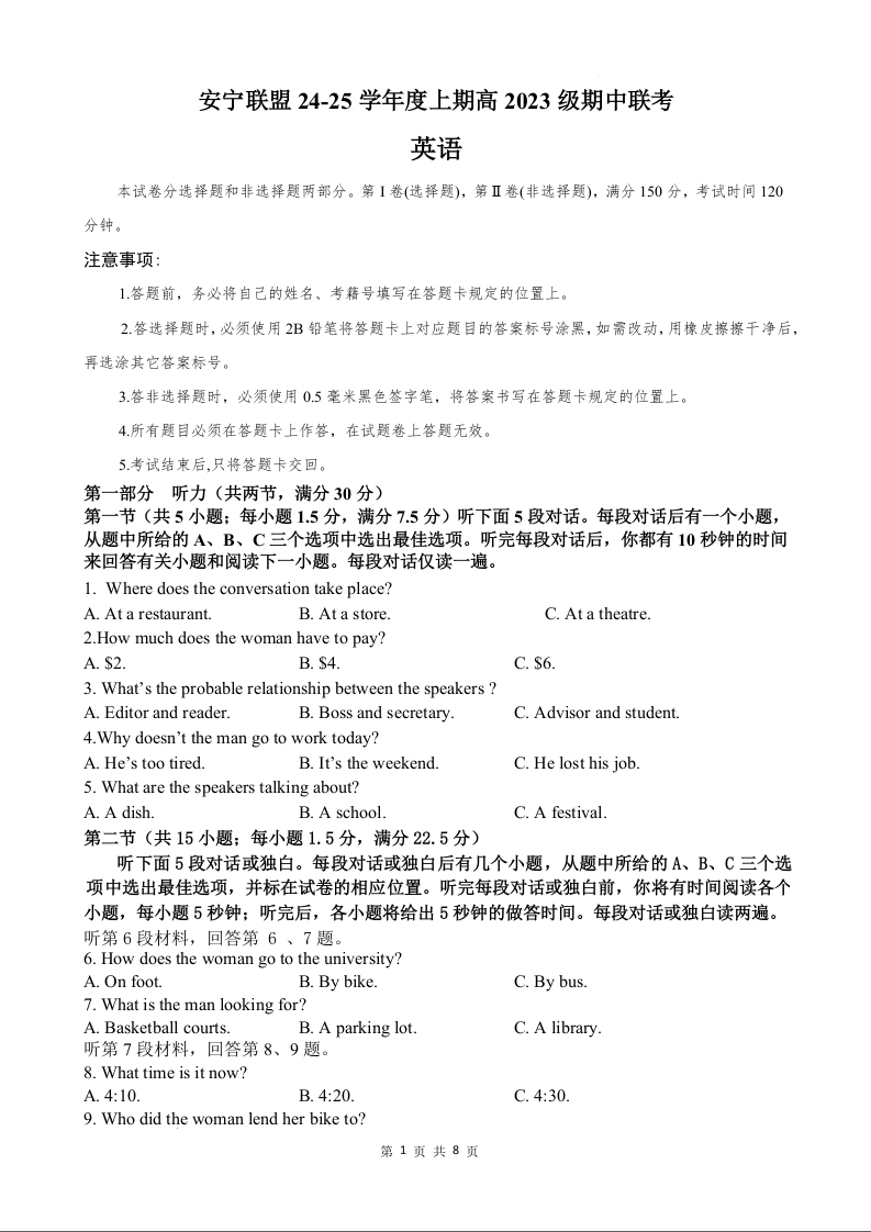 四川省安宁河高中振兴联盟2024-2025学年度上期高中2023级期中联考英语