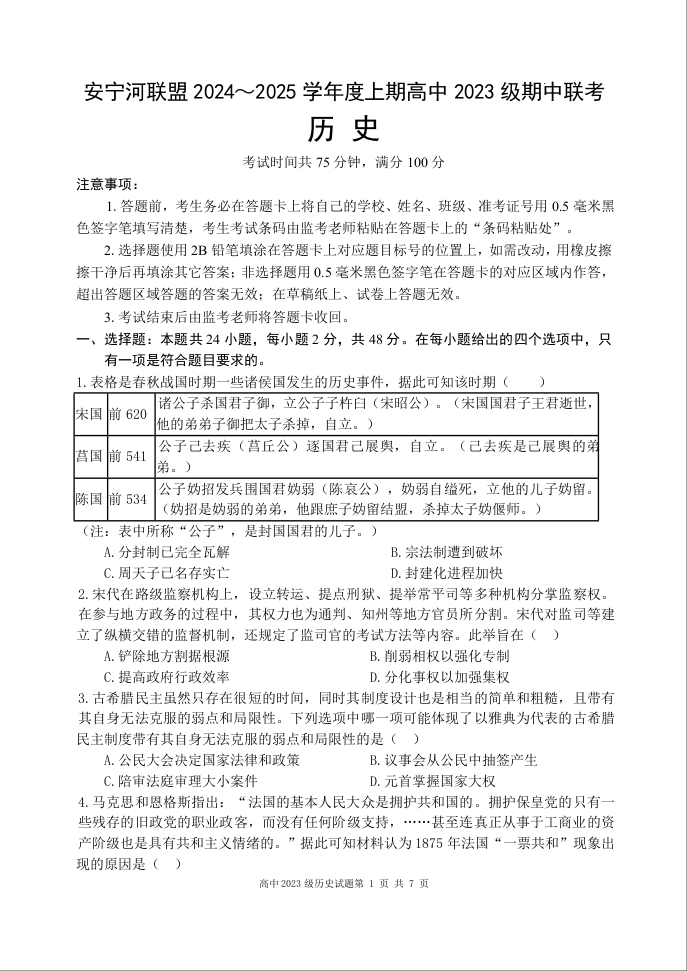 四川省安宁河高中振兴联盟2024-2025学年度上期高中2023级期中联考历史