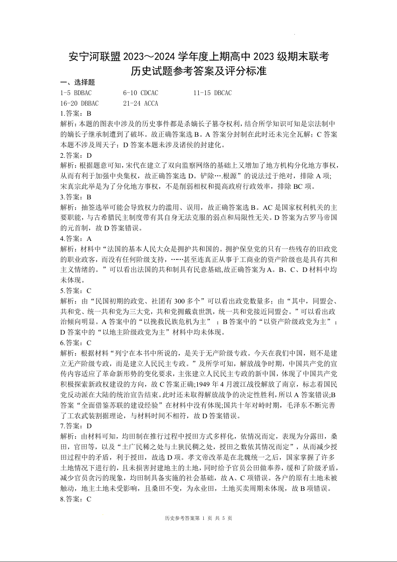 四川省安宁河高中振兴联盟2024-2025学年度上期高中2023级期中联考历史答案