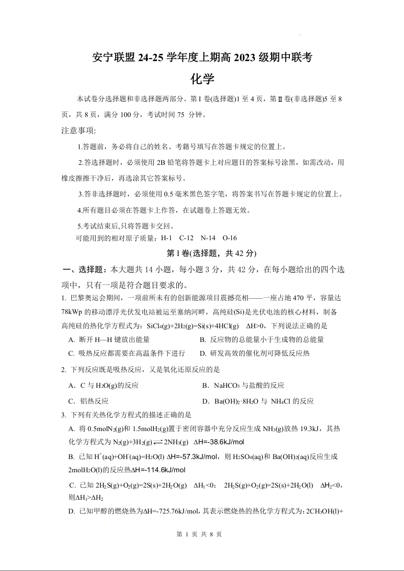 四川省安宁河高中振兴联盟2024-2025学年度上期高中2023级期中联考化学