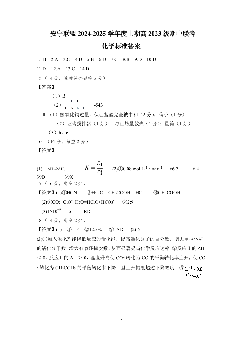 四川省安宁河高中振兴联盟2024-2025学年度上期高中2023级期中联考化学答案