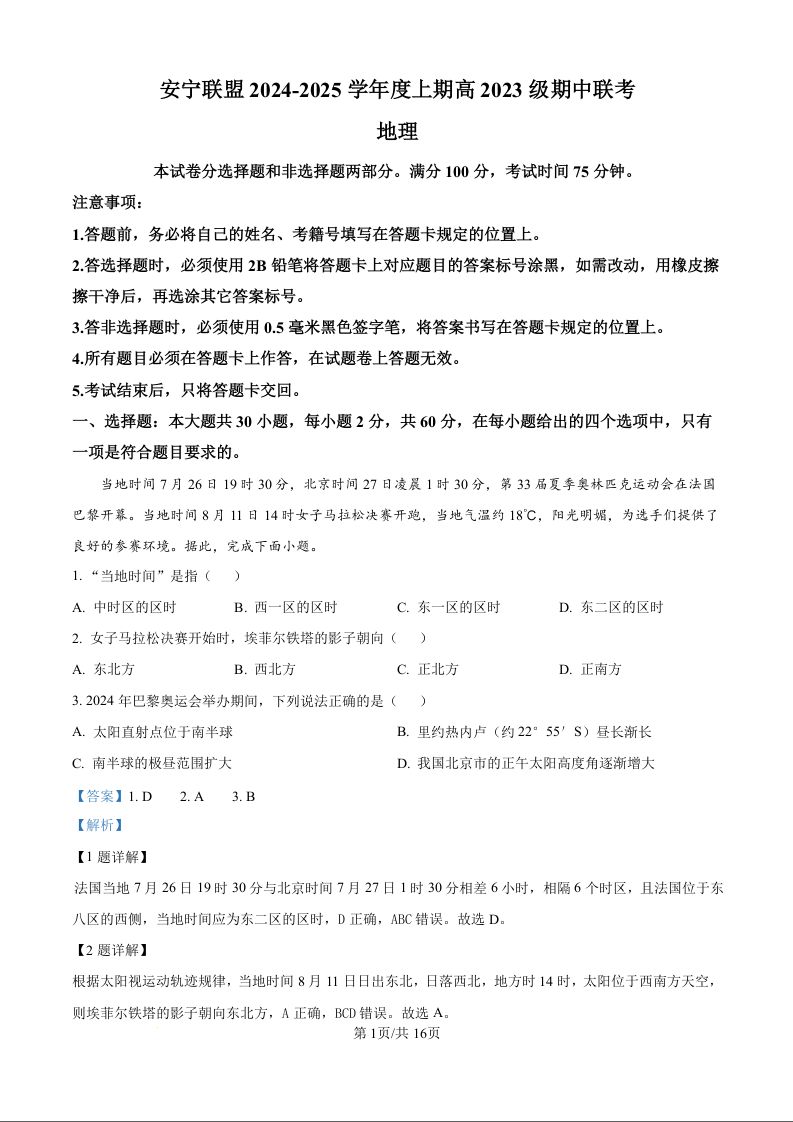 四川省安宁河高中振兴联盟2024-2025学年度上期高中2023级期中联考地理试题(解析版)