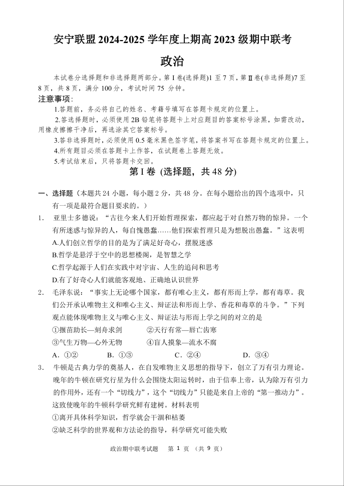 四川省安宁河高中振兴联盟2024-2025学年度上期高中2023级期中联考政治