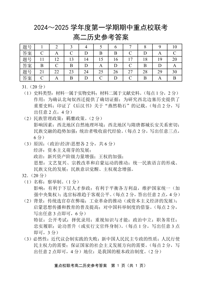 天津市五区县重点校联考2024-2025学年度第一学期期中联考历史答案