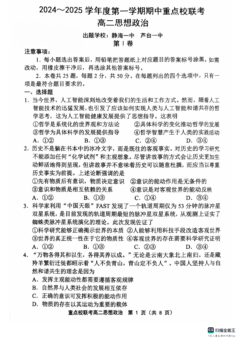 天津市五区县重点校联考2024-2025学年度第一学期期中联考政治