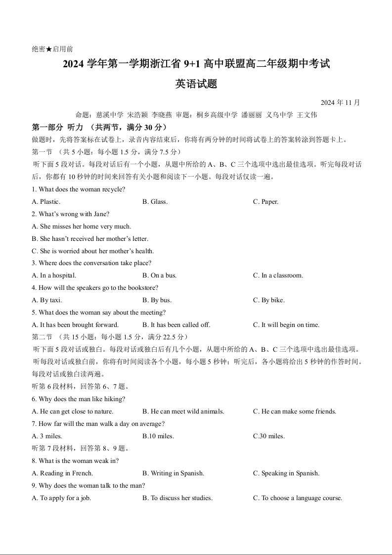 浙江省2024学年第一学期9+1高中联盟高二年级期中考试英语+答案