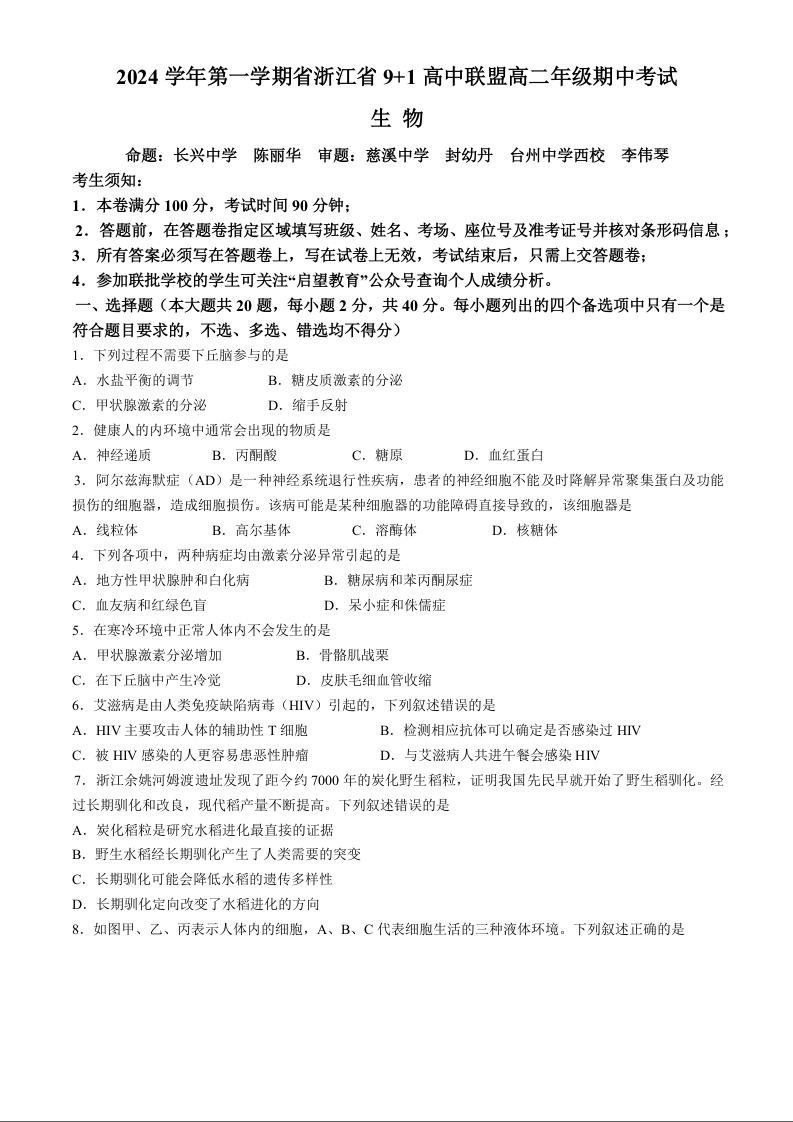 浙江省2024学年第一学期9+1高中联盟高二年级期中考试生物+答案