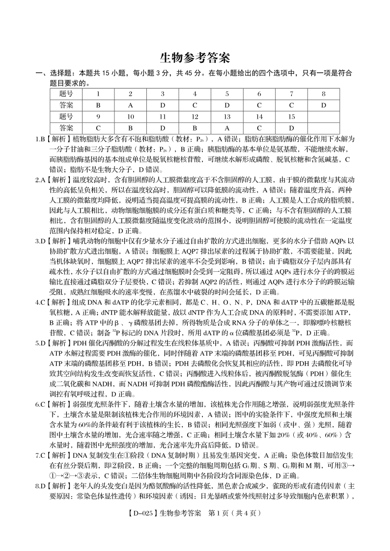 安徽省皖江名校2025届高三上学期12月质量检测生物答案
