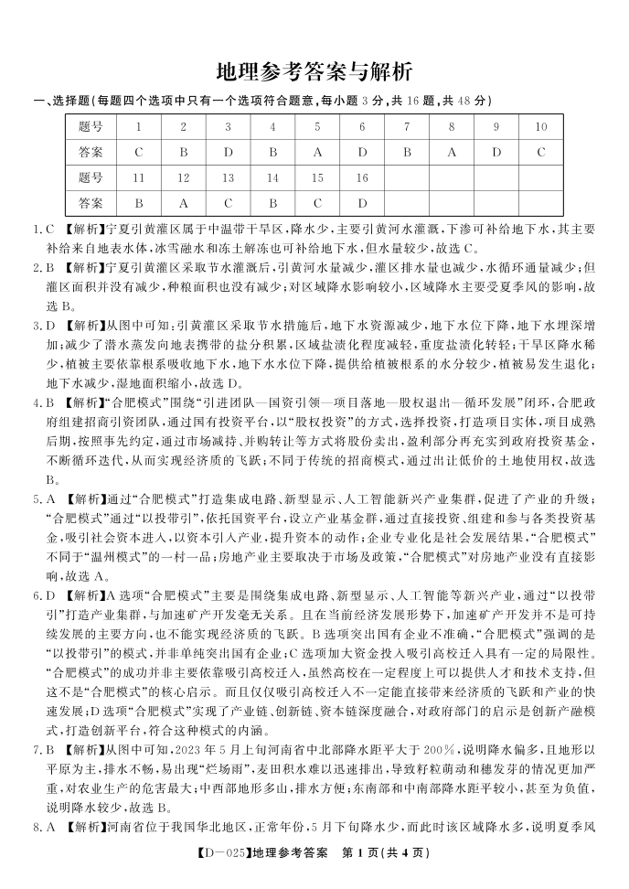 安徽省皖江名校2025届高三上学期12月质量检测地理答案