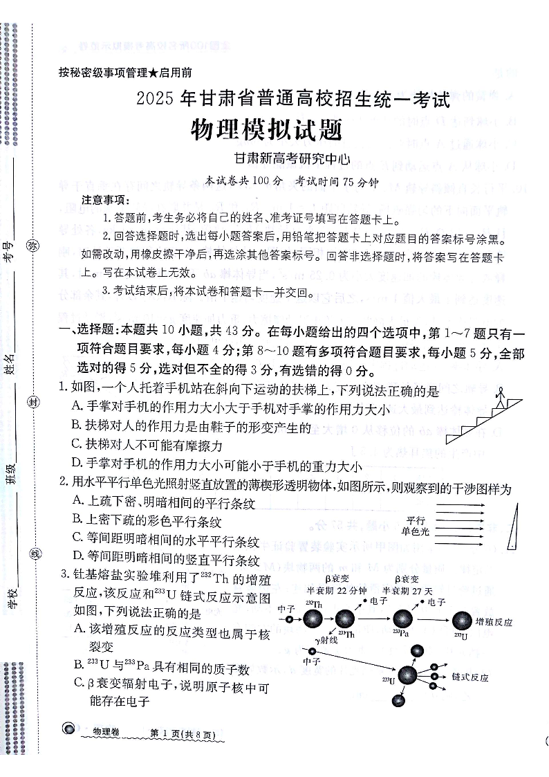 甘肃省部分学校2025届高三12月模拟测试联考物理