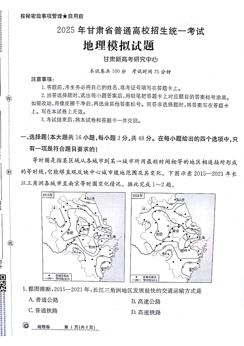 甘肃省部分学校2025届高三12月模拟测试联考地理
