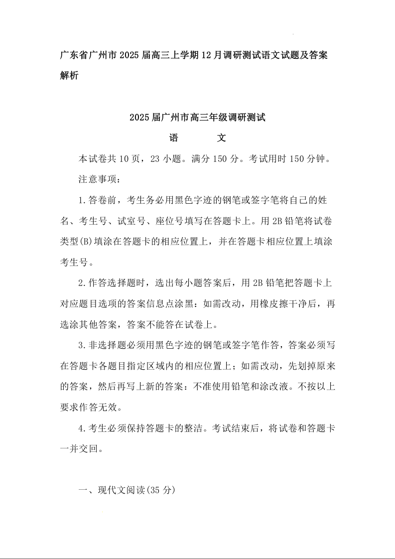 广东省广州市2025届高三上学期12月调研测试语文+答案