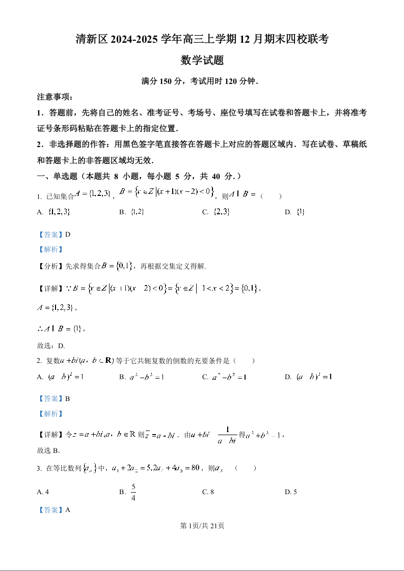 广东省清远市清新区四校2025届高三上学期期末联考数学(精品解析版)