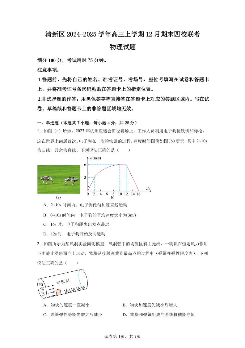 广东省清远市清新区四校2025届高三上学期期末联考物理+答案