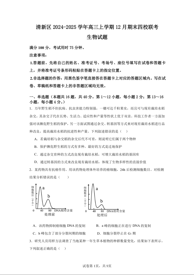 广东省清远市清新区四校2025届高三上学期期末联考生物+答案