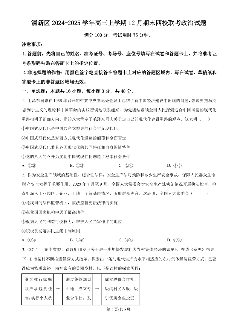 广东省清远市清新区四校2025届高三上学期期末联考政治(原卷版)