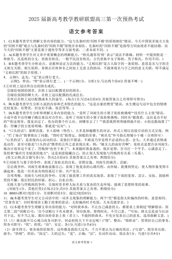 湖南省长郡二十校联盟2025届高三上学期第一次预热演练语文答案