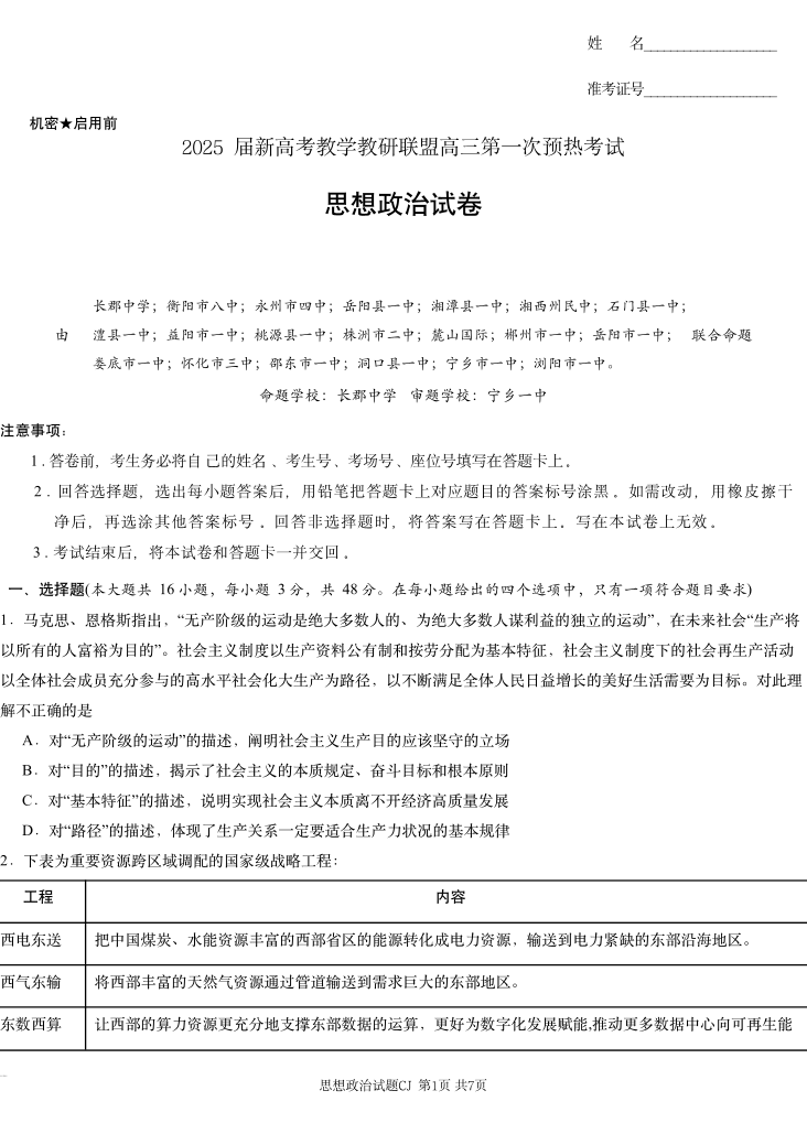 湖南省长郡二十校联盟2025届高三上学期第一次预热演练政治