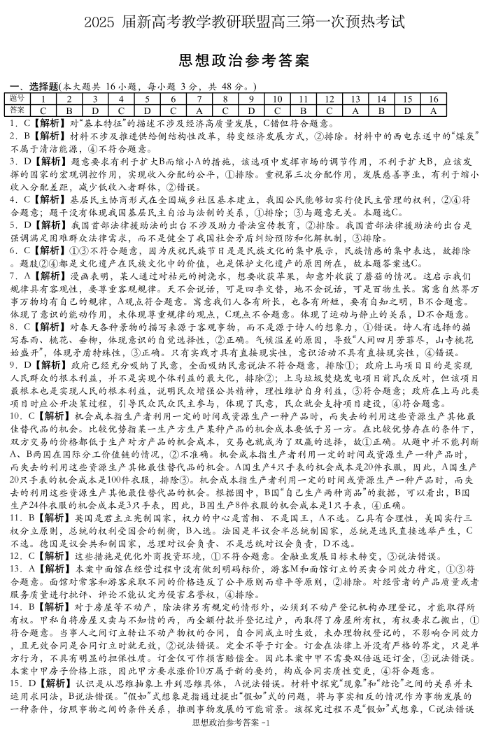 湖南省长郡二十校联盟2025届高三上学期第一次预热演练政治答案
