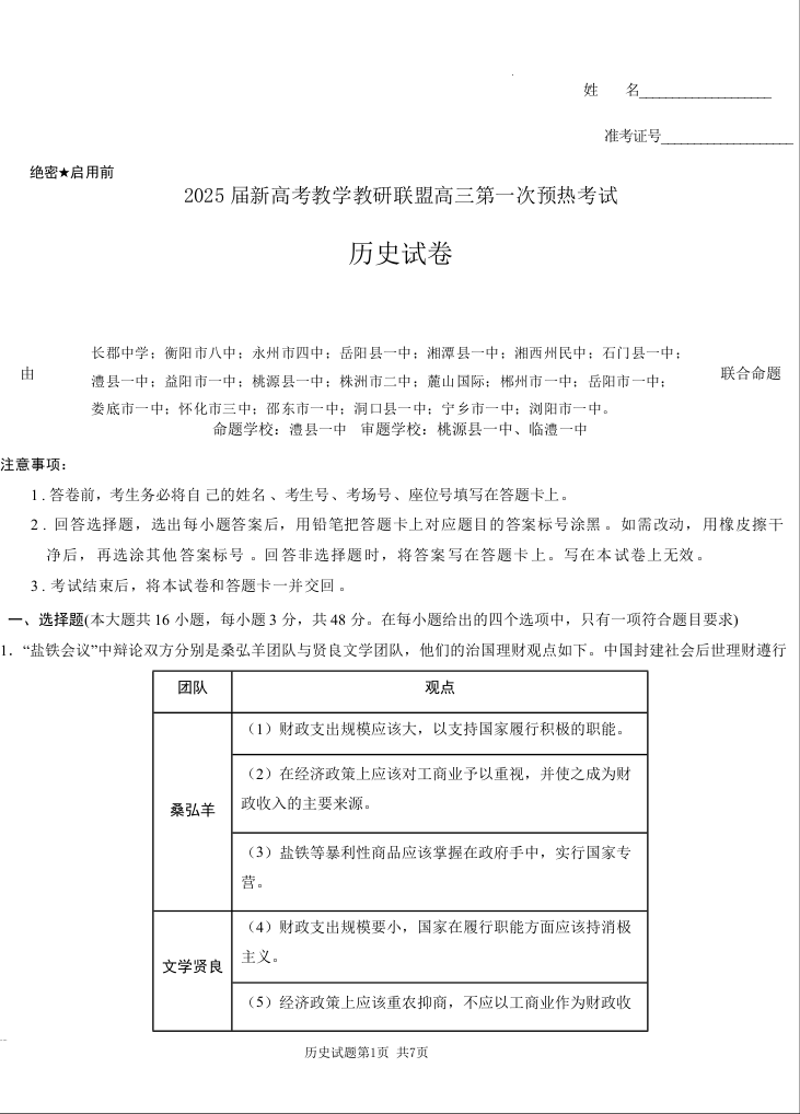 湖南省长郡二十校联盟2025届高三上学期第一次预热演练历史