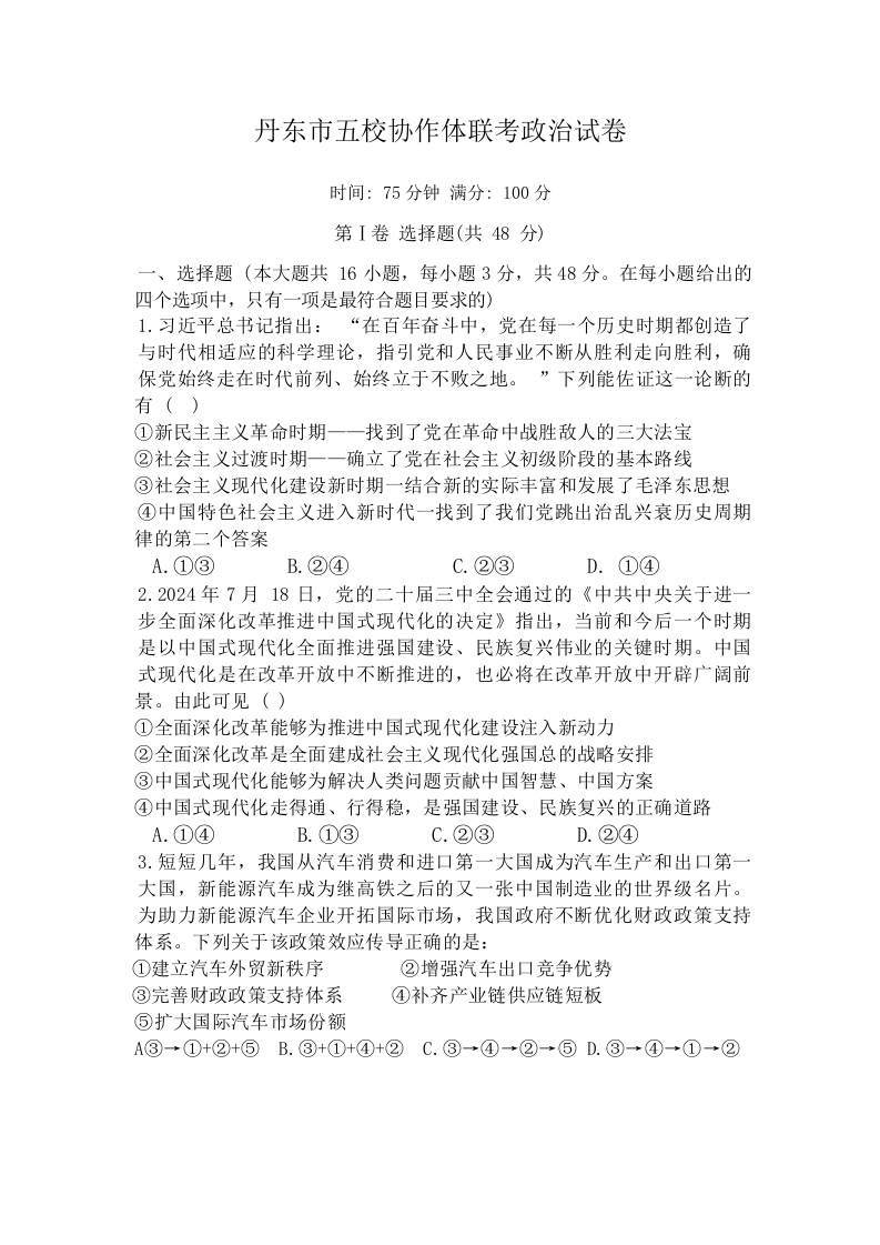 辽宁省丹东市五校协作体2025届高三上学期12月月考政治+答案