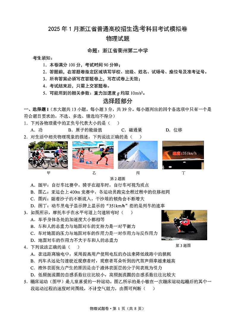 浙江省五校联盟2025届高三12月首考模拟物理