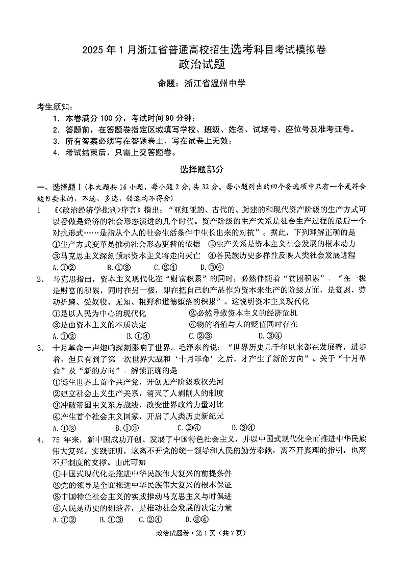 浙江省五校联盟2025届高三12月首考模拟政治
