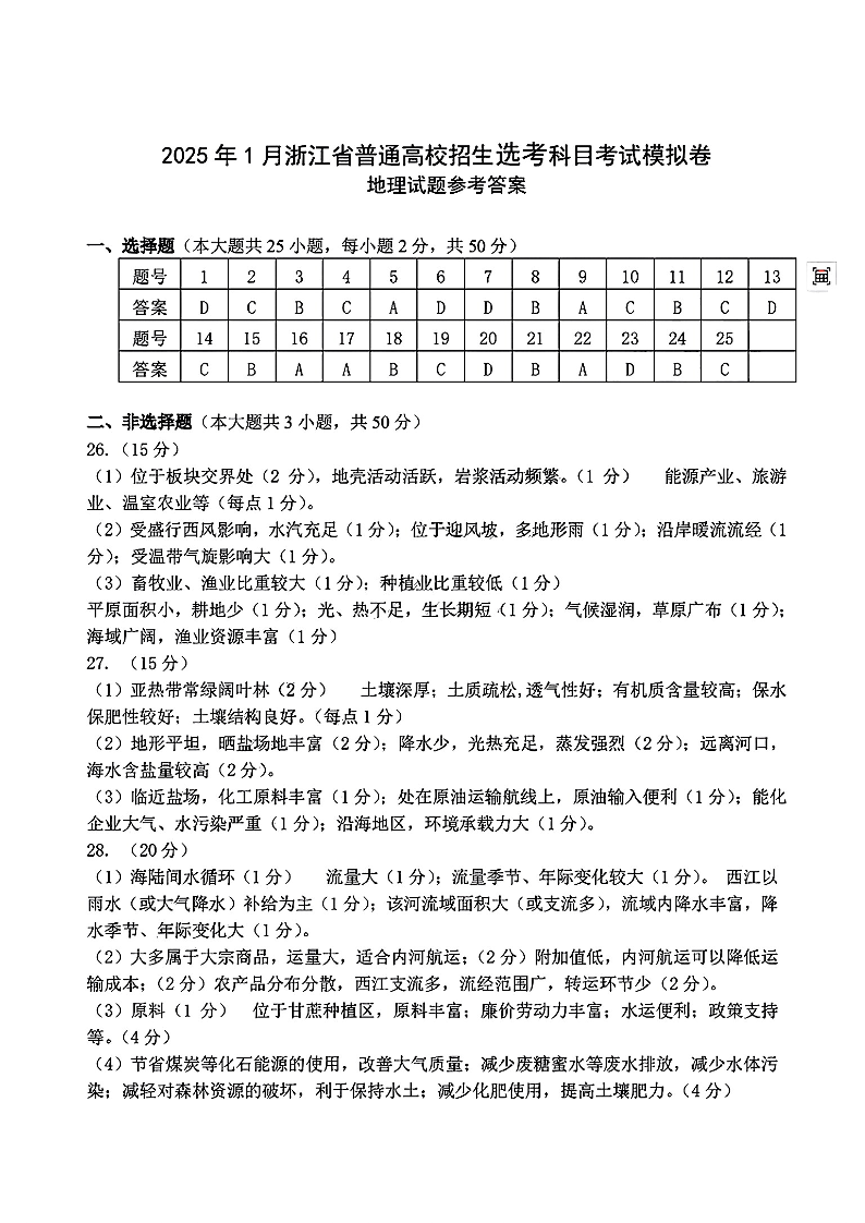 浙江省五校联盟2025届高三12月首考模拟地理答案