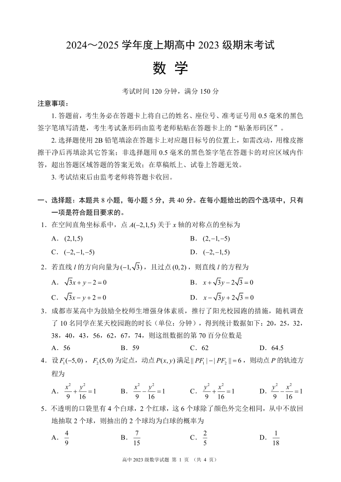 四川省成都市蓉城名校联盟2024-2025学年高二上学期期末考试数学