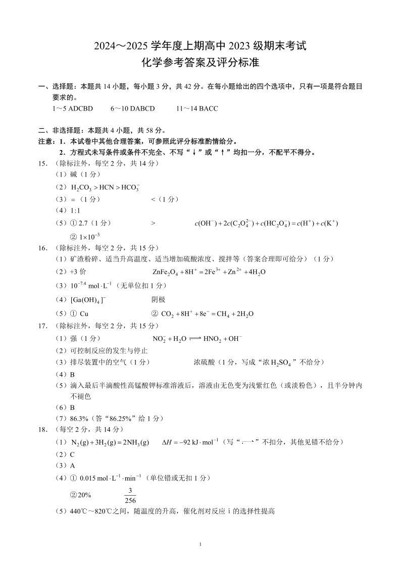 四川省成都市蓉城名校联盟2024-2025学年高二上学期期末考试化学答案