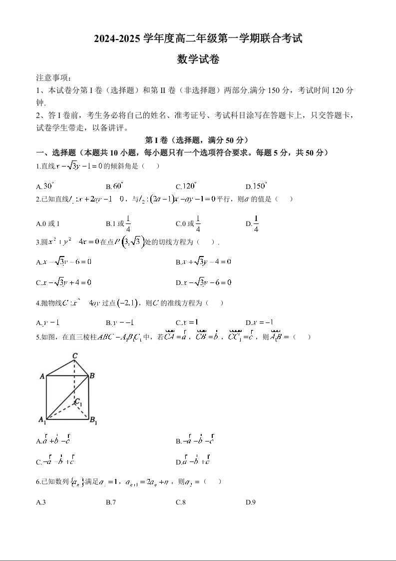 天津市三校2024-2025学年高二上学期12月联考试题数学+答案
