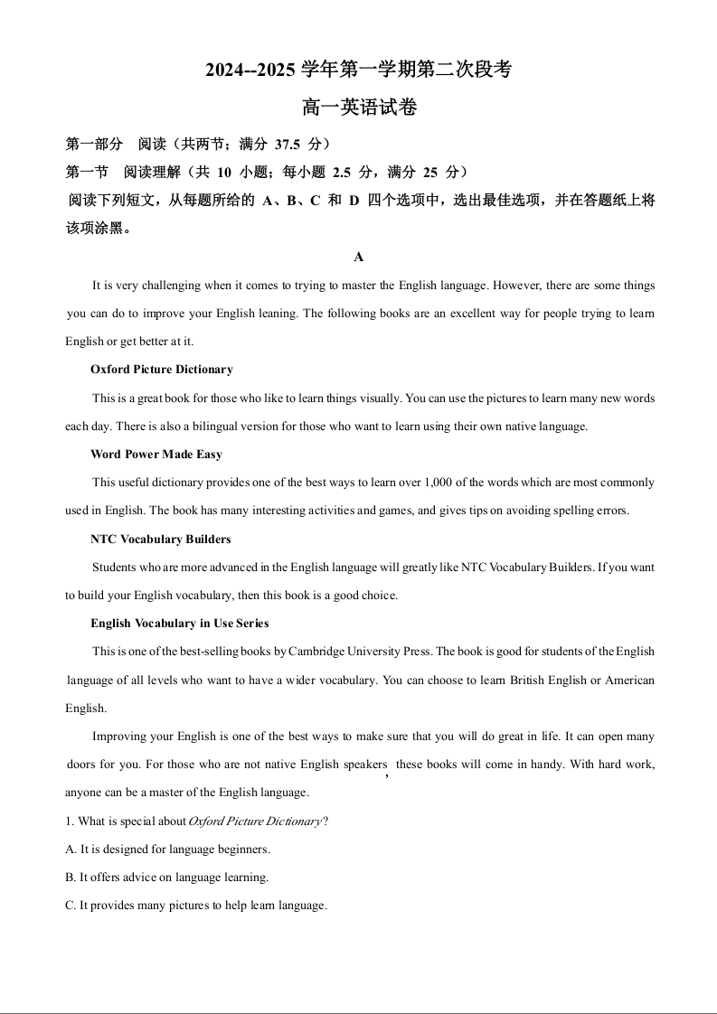 广东省肇庆市五校2024-2025学年高一上学期第二次段考试题英语