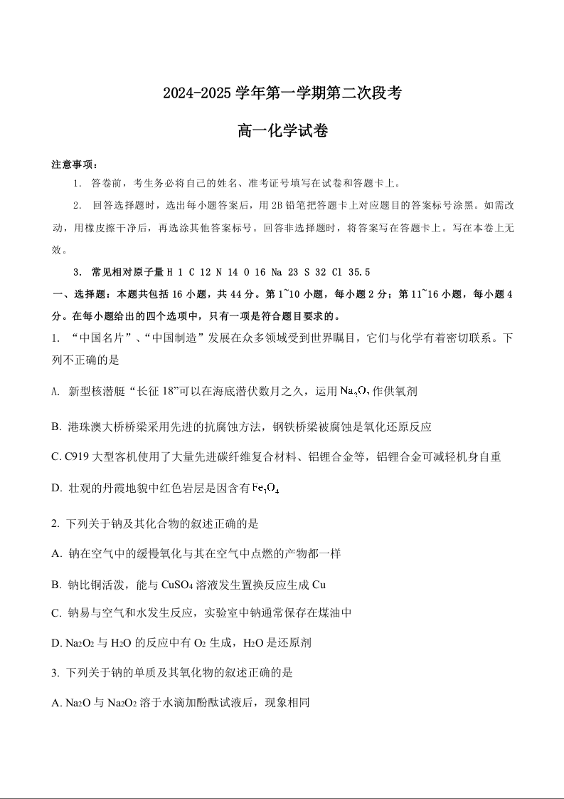 广东省肇庆市五校2024-2025学年高一上学期第二次段考试题英语化学+答案