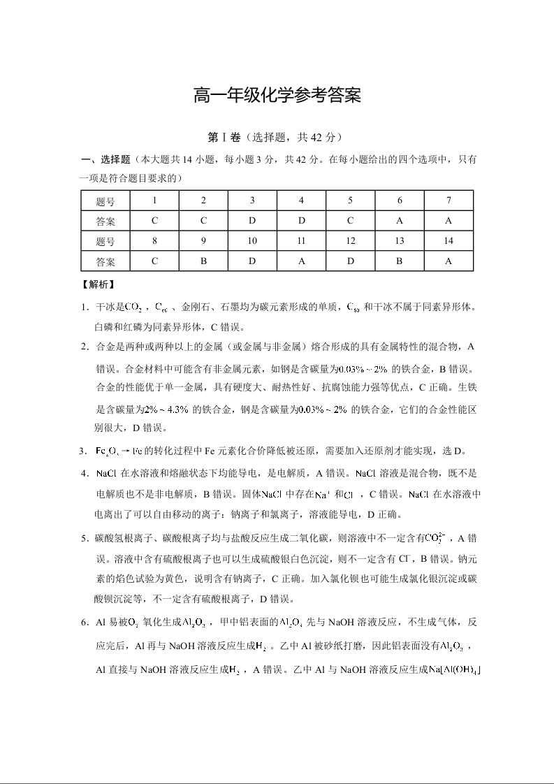云南省西双版纳傣族自治州部分学校2024-2025学年高一上学期12月月考化学答案