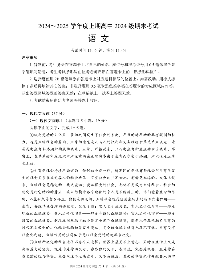 四川省成都市蓉城名校联盟2024-2025学年高一上学期期末考试语文