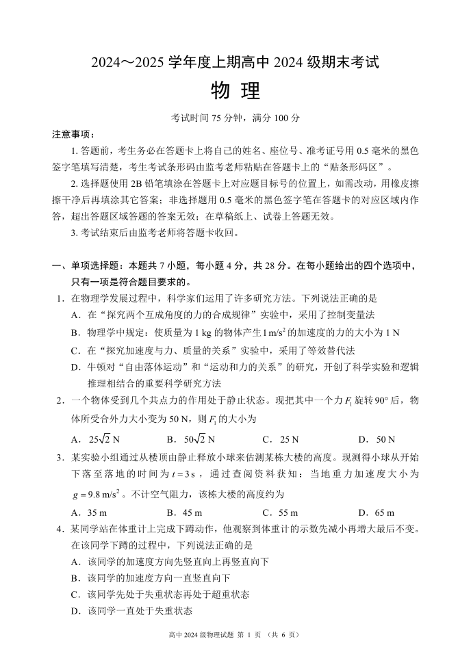 四川省成都市蓉城名校联盟2024-2025学年高一上学期期末考试物理