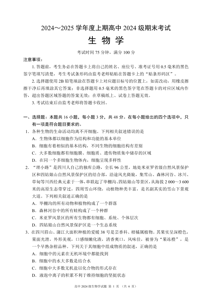 四川省成都市蓉城名校联盟2024-2025学年高一上学期期末考试生物