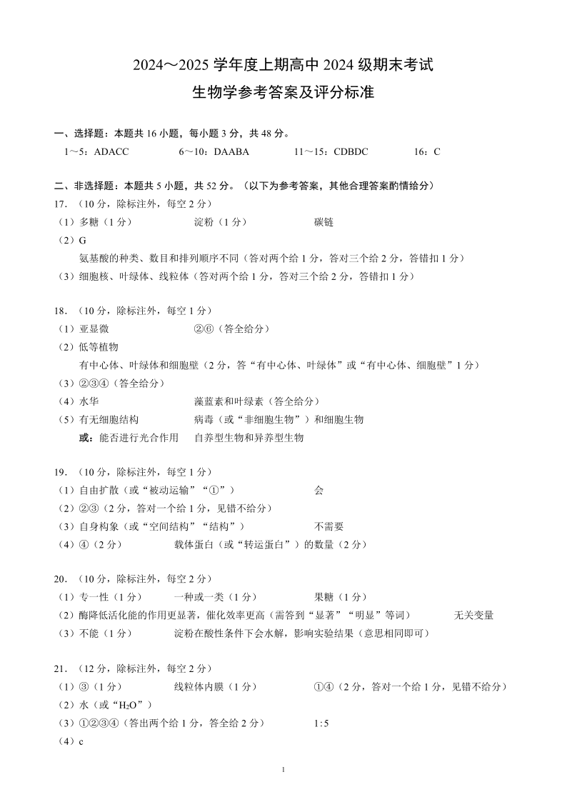 四川省成都市蓉城名校联盟2024-2025学年高一上学期期末考试生物答案