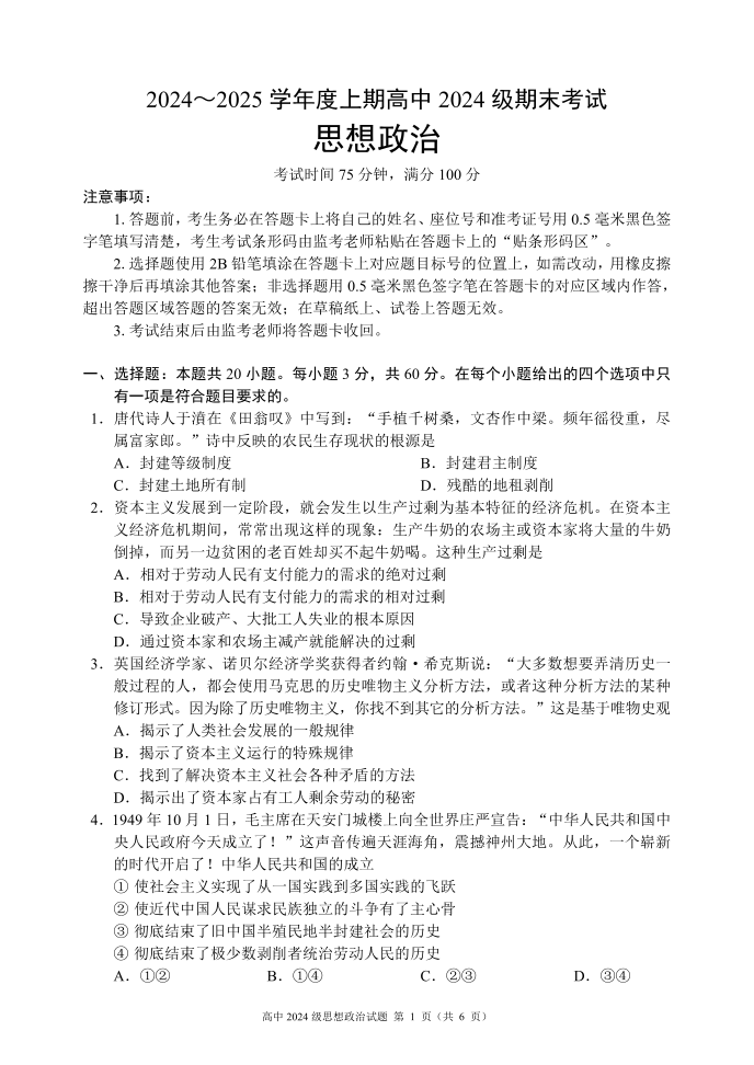 四川省成都市蓉城名校联盟2024-2025学年高一上学期期末考试政治