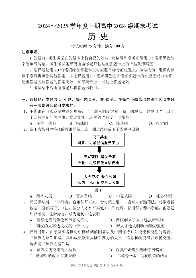 四川省成都市蓉城名校联盟2024-2025学年高一上学期期末考试历史