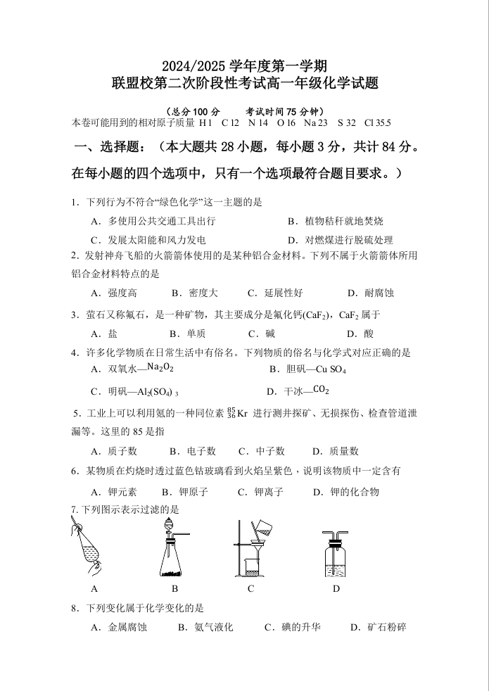 江苏省盐城市五校联考2024-2025学年高一上学期12月月考化学